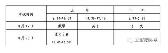 学生于8月19日上午7:30到校,8点开始持中考准考证参加考试。本次考试一律在答题卡上做答,采用网上阅卷。8月21日公布成绩,8月24日下午3:00按照组建的班级组织开学报到注册,晚正常上晚自习,8月25日正式上课。