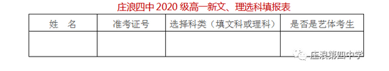 开学初实行文、理分科,高一新生在暑假期间要根据自己的学科喜好、特长,与家长共同商量确定选文科还是选理科,高考时文科方向考语文、数学、英语、政治、历史、地理学科,理科方向考语文、数学、英语、物理、化学、生物学科。家长扫码加入庄浪四中2020级高一钉钉群,于8月15日前按照下表的格式填写(可自行绘制或拍照上传)并上传至群里。学校根据学生所选科别安排开学考试考场,艺体类考生一般要求选取文科方向。