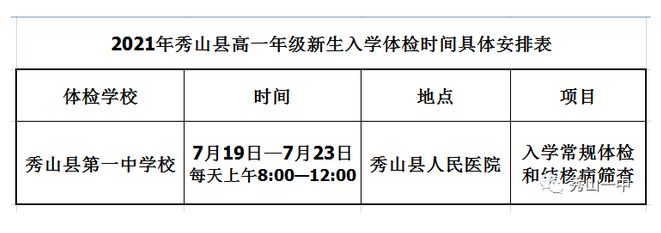 2. 体检时间:请在7月19日—7月23日(每天上午8:00—12:00)到到秀山县人民医院进行入学常规体检和结核病筛查,体检费100元,入学时将体检报告交给班主任。(具体注意事项见附件2)