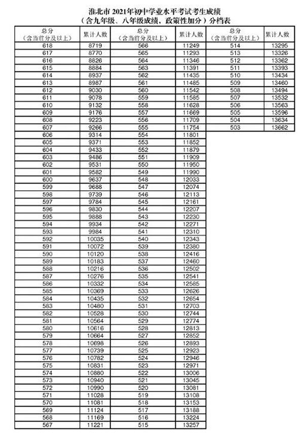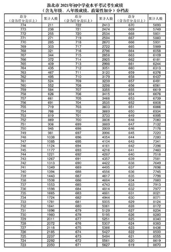 淮北市2021年初中学业水平考试考生成绩(含九年级、八年级成绩,政策性加分)分档表