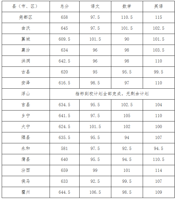(三)优质高中及临汾二中、临汾五中指标到校剩余计划择优录取最低录取控制分数线