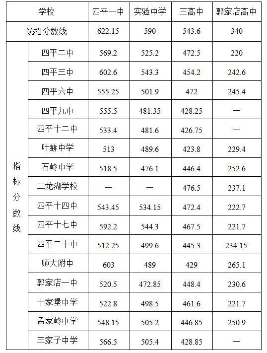 四平市第一高级中学622.15;四平市实验中学590;四平市第三高级中学543.6;郭家店高级中学340。