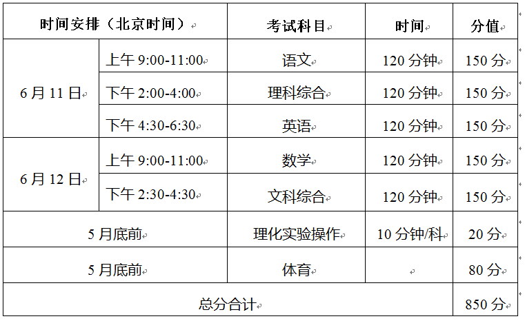 考查科目包括理化实验操作和体育,其分数计入中考总分。理化实验操作考试含物理、化学各10分;体育考试采取“3+X”(3项必考+1项选考)方式进行,其中必考内容为:一分钟跳绳20分、立定跳远20分、中长跑30分;选考内容为足球、篮球、排球和乒乓球中一项,分值为10分。